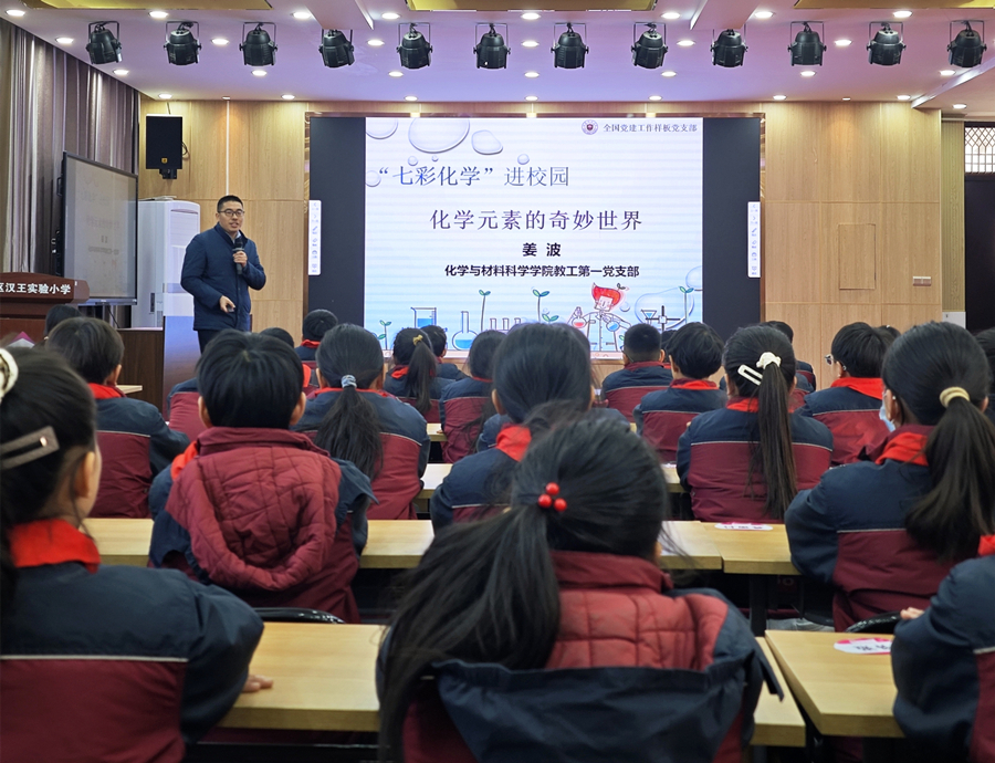 为激发青少年科学兴趣,提升科学素质,12月3日下午,化学与材料科学学院教工第一党支部赴铜山区汉王实验小学,开展“七彩化学校园行”科普进校园活动。学院党委书记吴晨、姜波教授、李团结教授和党员志愿者们为同学们带来了一堂沉浸式的化学科普课。