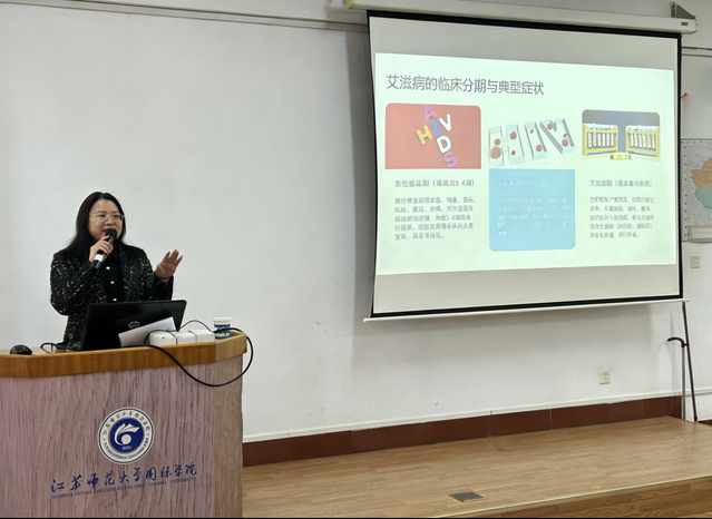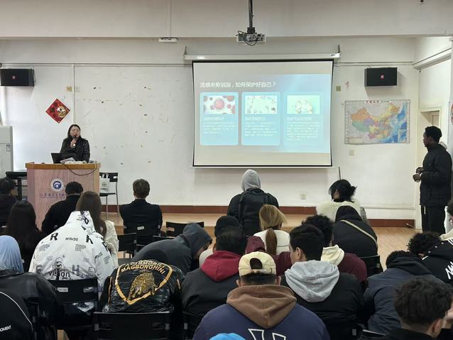 为增强留学生健康防护意识,筑牢校园公共卫生安全屏障,国际学院于12月3日在401教室举办传染病防控专题讲座。本次活动特邀校医院院长张素琴担任主讲,围绕艾滋病与流感防控核心知识开展专题科普,近200名留学生参加。讲座由学院辅导员马瑞良老师主持。