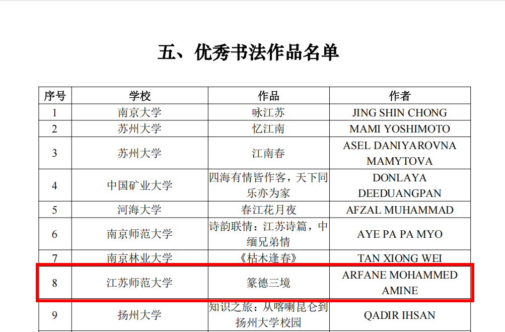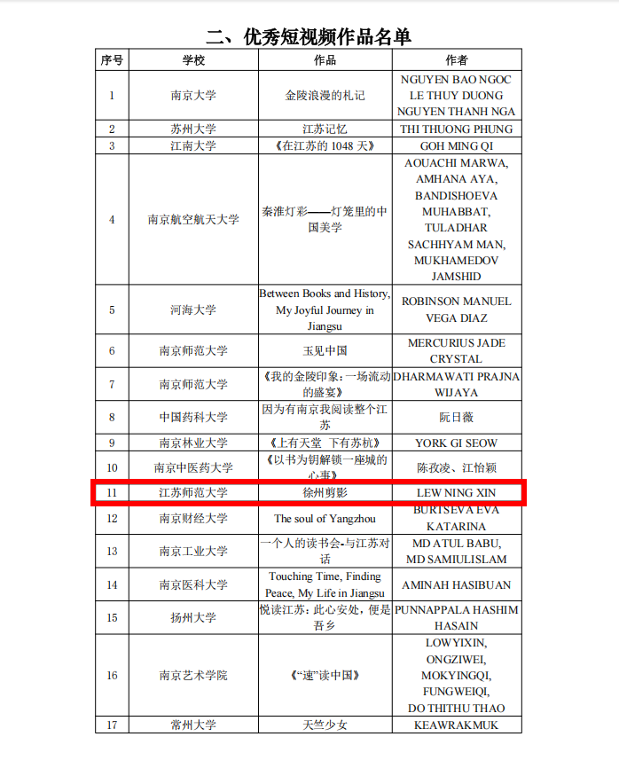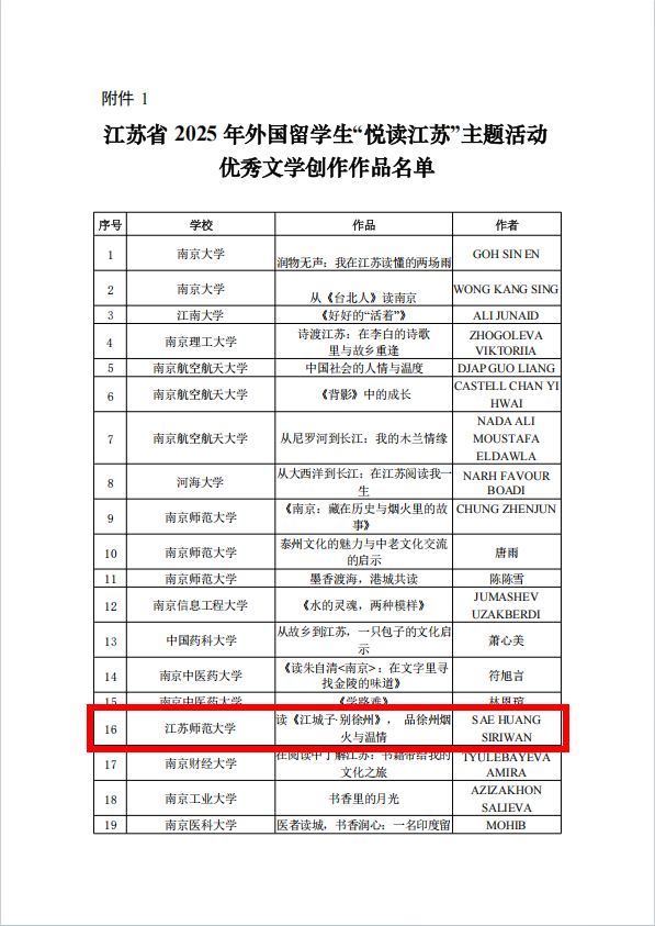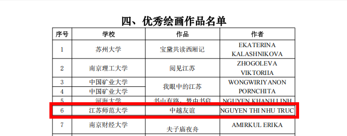 12月10日,在江苏省高等教育学会外国留学生教育管理研究委员会公布的2025年外国留学生“悦读江苏”主题活动中,我校四名留学生荣获佳绩。SAE HUANG SIERWAN的作品《读<江城子・别徐州>,品徐州烟火与温情》入选优秀文学创作作品;LEW NING XIN的《徐州剪影》入选优秀短视频作品;NGUYEN THI NHU TRUC的《中越友谊》入选优秀绘画作品;ARFANE MOHAMMED AMINE的《篆德三境》入选优秀书法作品。