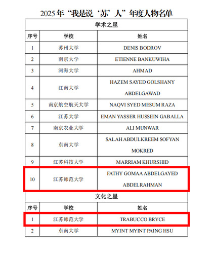 12月4日,在江苏省高等教育学会外国留学生教育管理研究委员会公布的2025年度“我是说‘苏’人”年度人物评选中,我校两名留学生经过多轮严格评审,最终脱颖而出。埃及籍生物学专业博士生范希(FATHY GOMAA ABDELGAYED ABDELRAHMAN)凭借突出的科研成绩获评“学术之星”;美国籍民族传统体育专业本科生陶海晨(TRABUCCO BRYCE)以丰富的文化传播实践获评“文化之星”。