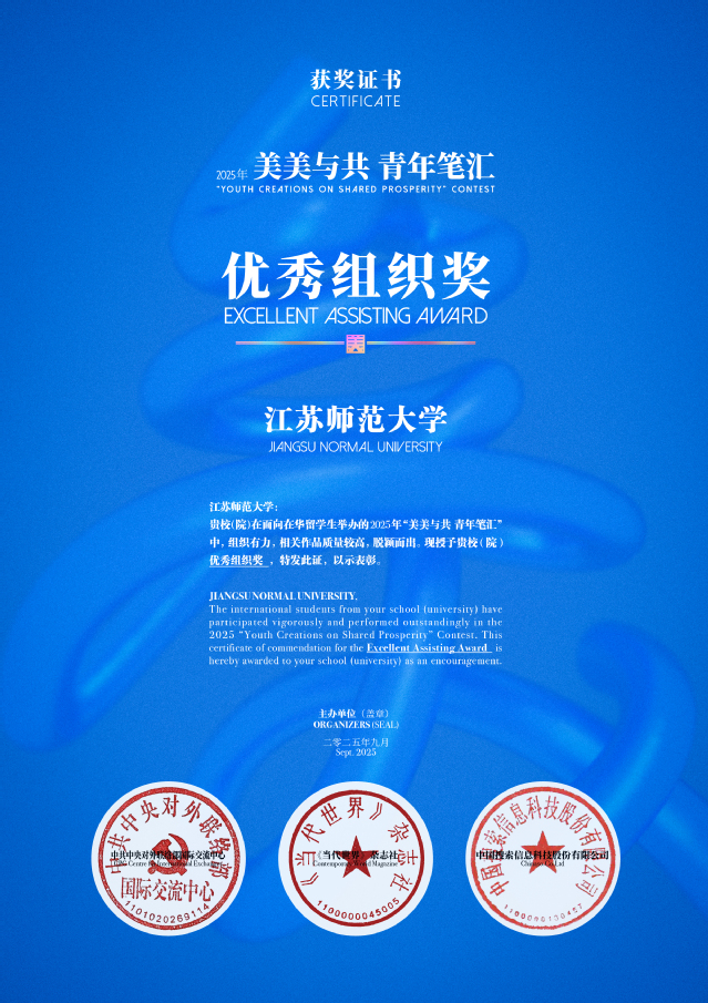 近日,我校留学生教育捷报频传。在第二届“美美与共青年笔汇”活动、2025年江苏省“我是说‘苏’人”年度人物评选与2025年外国留学生“悦读江苏”主题活动中,我校留学生屡获佳绩,展现出扎实的中文功底、深刻的文化洞察力和卓越的跨文化沟通能力。这些成绩的取得,生动体现了我校国际化人才培养质量的持续提升,也彰显了学校在推动文明互鉴、促进中外青年交流方面取得的扎实成效。