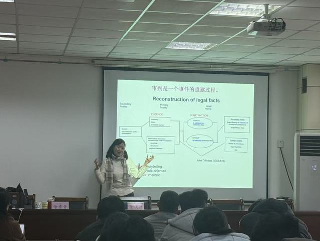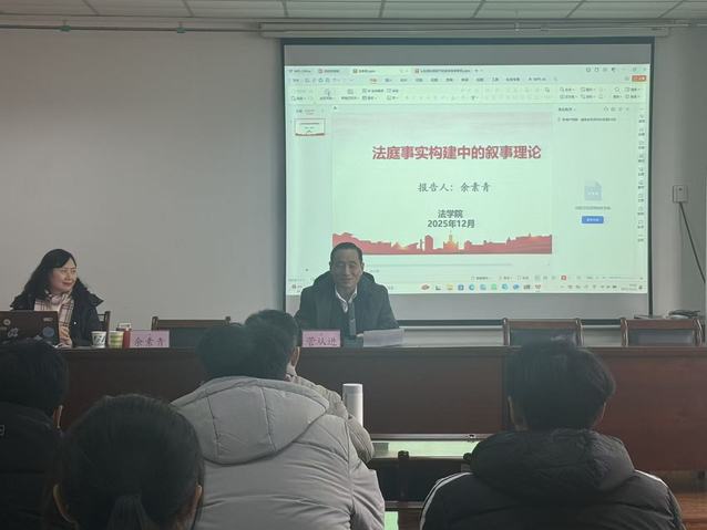 2025年12月12日下午,华东政法大学外语学院院长余素青教授应邀在江苏师范大学法学院举办讲座,主题为“法庭事实构建中的叙事理论”。讲座由江苏师范大学法学院菅从进教授主持。