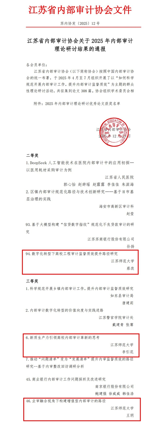 二、在2025年4月至7月开展的“如何科学规范开展内部审计工作,提升内部审计监督质效”主题理论研讨活动中,审计处提交的三篇论文全部获奖:《数字化转型下高校工程审计监督质效提升路径研究》(作者:蔡改)获二等奖,《新质生产力引领高校内部审计革新的思考》(作者:李引花)和《业审融合视角下构建增值型内部审计的路径》(作者:王玥)获三等奖。