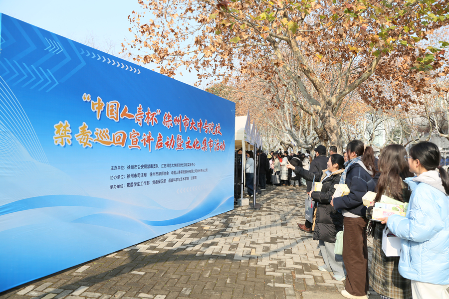 12月24日下午,由徐州市公安局禁毒支队、江苏师范大学新时代文明实践中心主办的“中国人寿杯”徐州市大中专院校禁毒巡回宣讲启动仪式在江苏师范大学举行。校党委常委、宣传部部长孟召学,徐州市公安局禁毒支队支队长葛晓华出席活动,全市大中专院校相关负责人及禁毒志愿者学生代表约400人参加活动。