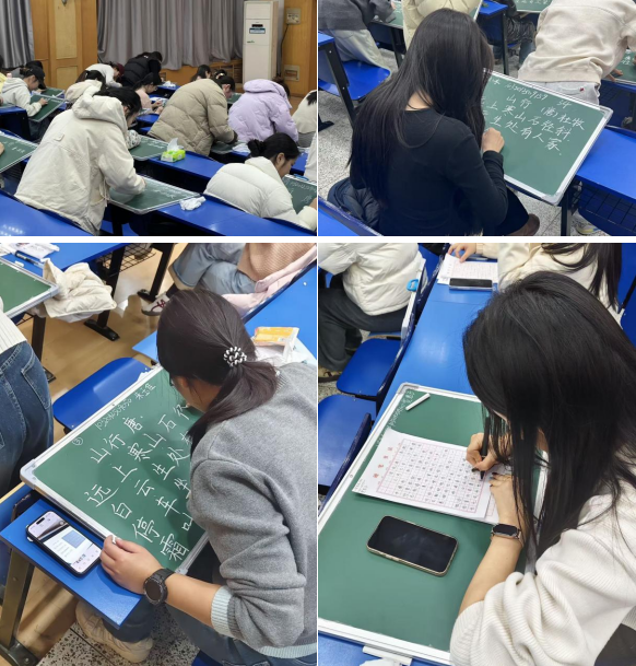 参赛选手在三十分钟内完成硬笔书法《满江红》和粉笔书法《泊秦淮》,由评委会进行评分。硬笔字比赛中,选手们凝神静气,笔尖起落见功底;粉笔字比赛中,选手们立板挥毫,撇捺之间显真章。同学们的每一次落笔都饱含对教育事业的赤诚,每一处笔画都镌刻着平日深耕不辍的印记。经过评委会评议,41名选手凭借扎实的书写功底脱颖而出,晋级决赛。