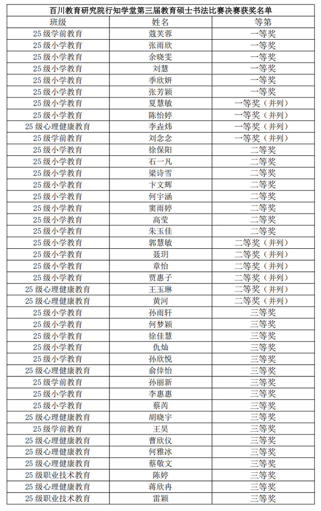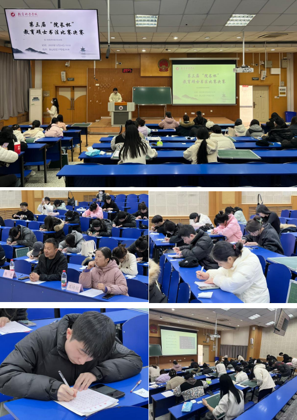 为进一步夯实学院教育硕士教学基本功,强化书写规范意识,教育科学学院(教师教育学院)百川教育研究院行知学堂于12月17日、24日在17号楼教室分阶段举办第三届教育硕士粉笔字、硬笔字书法初赛和决赛。比赛特邀专业教师王靖懿、陈健等参与评审,全体2025级教育硕士参赛。