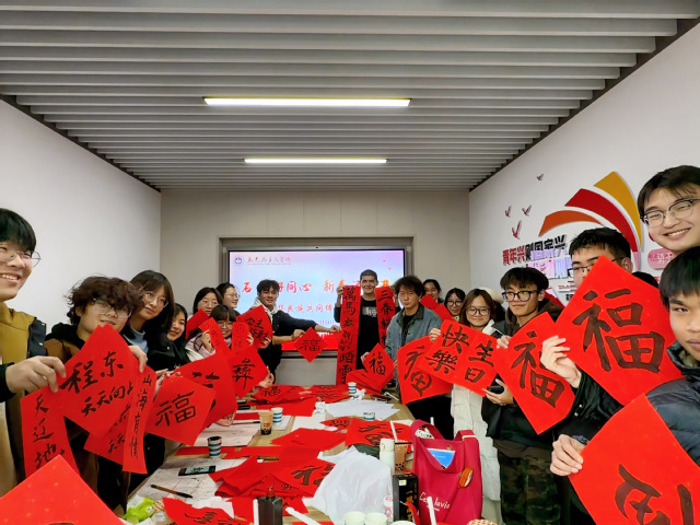 活动的最后,师生一起铺开红纸,提起毛笔,在墨香中共迎新春。“贵在参与,黔程似锦”“陇上勤耕,鹏程万里”……一句句融合地域认同与美好祝愿的祝福落笔成联,一张张“福”字饱含深情。同学们手捧春联字合影,笑容里满是节日的喜悦与归属。2024级白玛康卓动情地说:“在这里我们感受到了家的温暖,以后我们会互帮互助,像石榴籽一样紧紧抱在一起,不辜负老师的期望。”