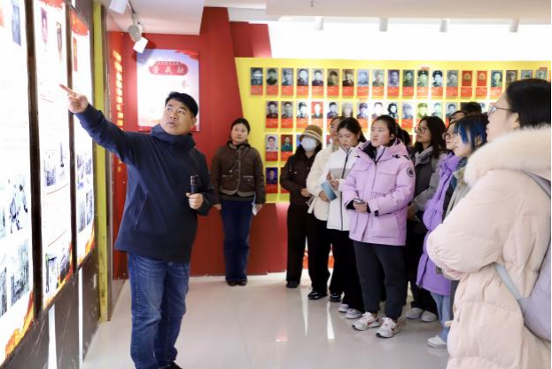 随后,一行人走进村庄核心区,整洁的中心广场、便民的爱民桥尽显宜居风貌。官庄村由两村合并而成,辖6个村民小组、常住人口2800人。在朱书记介绍下,同学们参观了老年人服务站、党群服务中心,了解到村“两委”5名成员与85名党员构成的组织保障体系。在革命先辈照片墙前,大家深刻感悟到红色精神的传承力量。