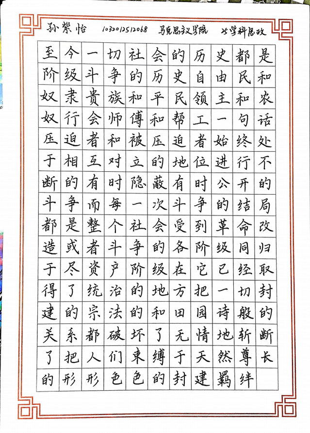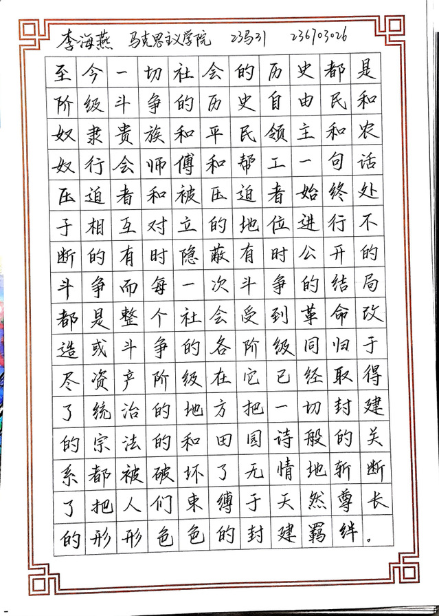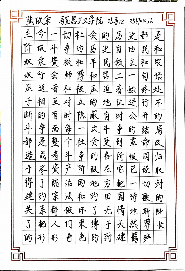 初赛阶段,参赛同学以马克思主义经典原著为内容,借助纸笔于云端展开竞技。在一横一竖、一撇一捺之间,同学们既展示了扎实的硬笔书法功底,也在书写中进一步领悟经典文本的思想内涵。