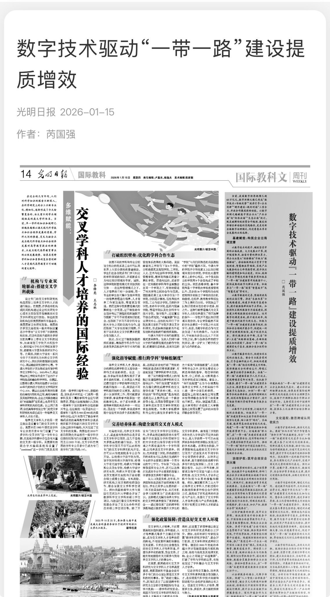 2026年1月15日,《光明日报》刊发我校党委书记、“一带一路”研究院院长芮国强署名文章《数字技术驱动“一带一路”建设提质增效》。文章系统阐述了如何以数字技术赋能“一带一路”建设,推动中国企业实现从“产品出海”到“标准出海”“生态出海”的转型升级。文章从基建赋能、治理护航、文化适配三大维度切入,深入剖析了数字丝绸之路的建设路径与战略意义,为新时期推动共建“一带一路”高质量发展提供了清晰的行动框架。全文兼具理论前瞻性与实践指导性,是对数字时代国际合作新模式的有力探索。全文如下: