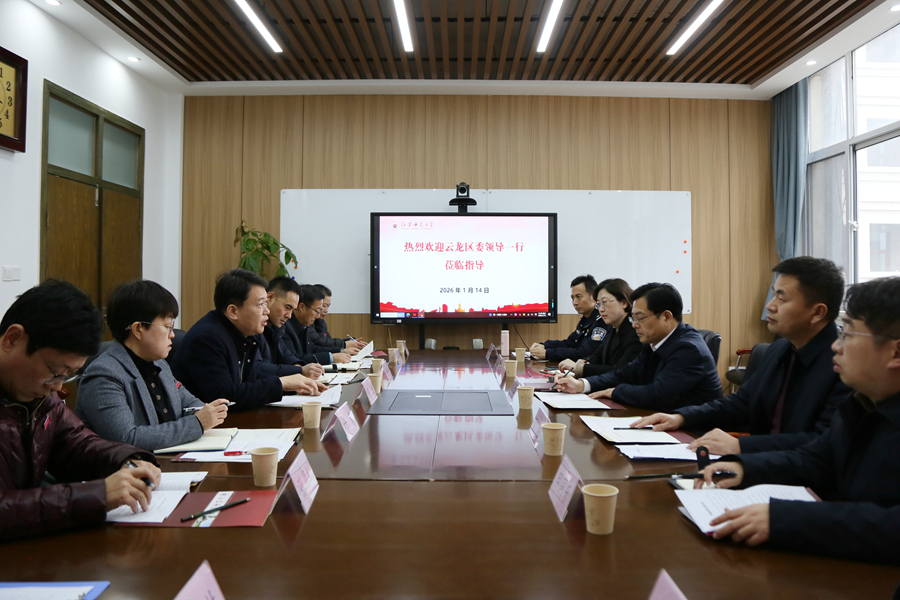 1月14日,云龙区委副书记李强率区委办、区教育局、区科技局、彭城街道及彭城派出所等单位相关负责同志来到云龙校区,就高校安全稳定工作与校地融合发展进行专题调研并座谈交流。校党委常委、纪委书记、派驻监察专员闾浩主持会议并讲话,学校相关职能部门负责人参加座谈。
