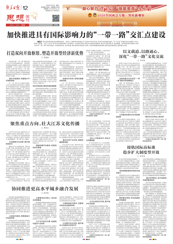 高质量共建“一带一路”是推进高水平对外开放的战略举措。当前国际经贸格局深刻重构,全球产业链供应链加速调整。“十五五”时期,江苏作为经济大省、开放大省,如何以“一带一路”交汇点建设为总揽,加快建设具有世界聚合力的双向开放枢纽,在服务构建新发展格局中展现更大作为,是需要回答好的时代命题。