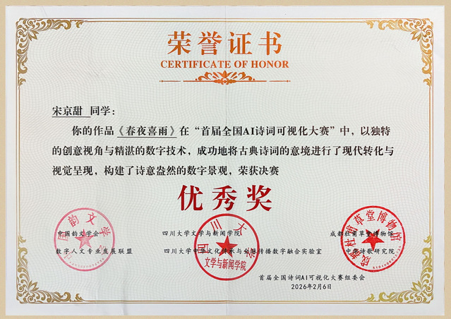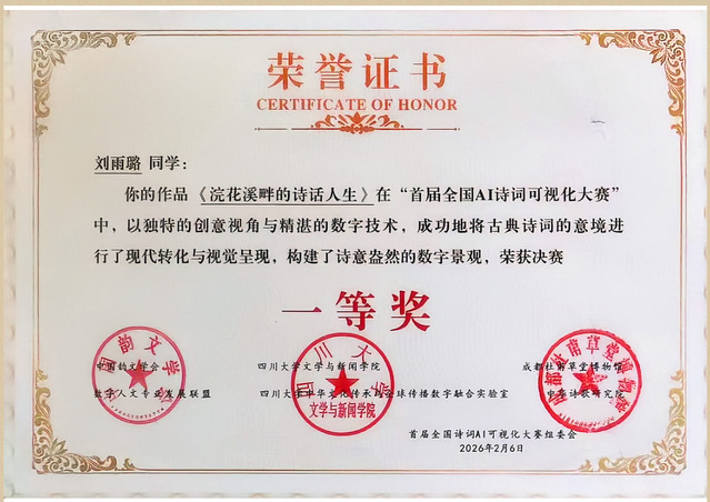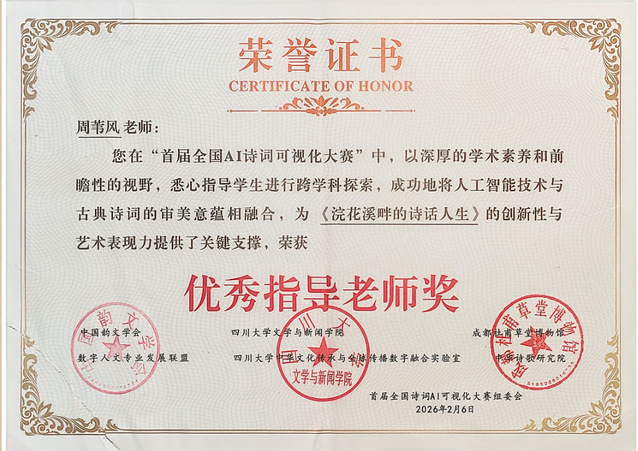 近日,由中国韵文学会、中华诗歌研究院、数字人文专业发展联盟主办,四川大学文学与新闻学院、成都杜甫草堂博物馆、四川大学中华文化传承与全球传播数字融合实验室承办的首届全国AI诗词可视化大赛评选结果揭晓。本次大赛经作品征集、初选、终评及公示等环节,最终评选出一等奖8名、二等奖14名、三等奖17名、优秀奖32名。文学院研究生刘雨璐、宋京甜分别荣获一等奖和优秀奖,周苇风老师获评“优秀指导老师奖”。