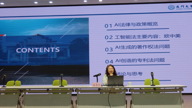在演讲环节,林教授以人工智能技术的发展历程为切入点,结合自身多年研究与实务观察,详细介绍了人工智能从弱人工智能向强人工智能快速演进的现实态势。她深入分析了欧中美三个国家在人工智能领域的发展路径与监管差异,并围绕人工智能生成内容标识、数据训练合法性、生成物可版权性等知识产权前沿问题,结合国内外立法实践与典型司法判例,系统阐释了人工智能技术对传统知识产权制度带来的冲击与挑战。同时林教授就人工智能合理使用规则适用、权利归属认定、未来立法完善等关键问题提出了独到见解。