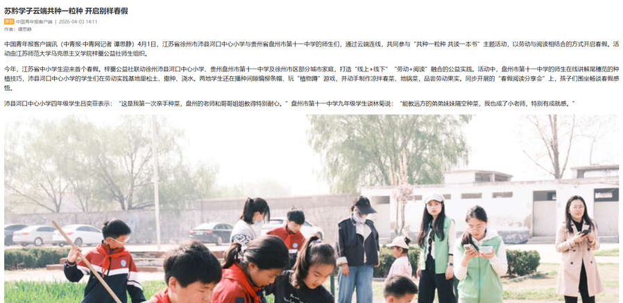中国青年报客户端讯(中青报·中青网记者 谭思静)4月1日,江苏省徐州市沛县河口中心小学与贵州省盘州市第十一中学的师生们,通过云端连线,共同参与“共种一粒种 共读一本书”主题活动,以劳动与阅读相结合的方式开启春假。活动由江苏师范大学马克思主义学院梓蔷公益社师生组织。