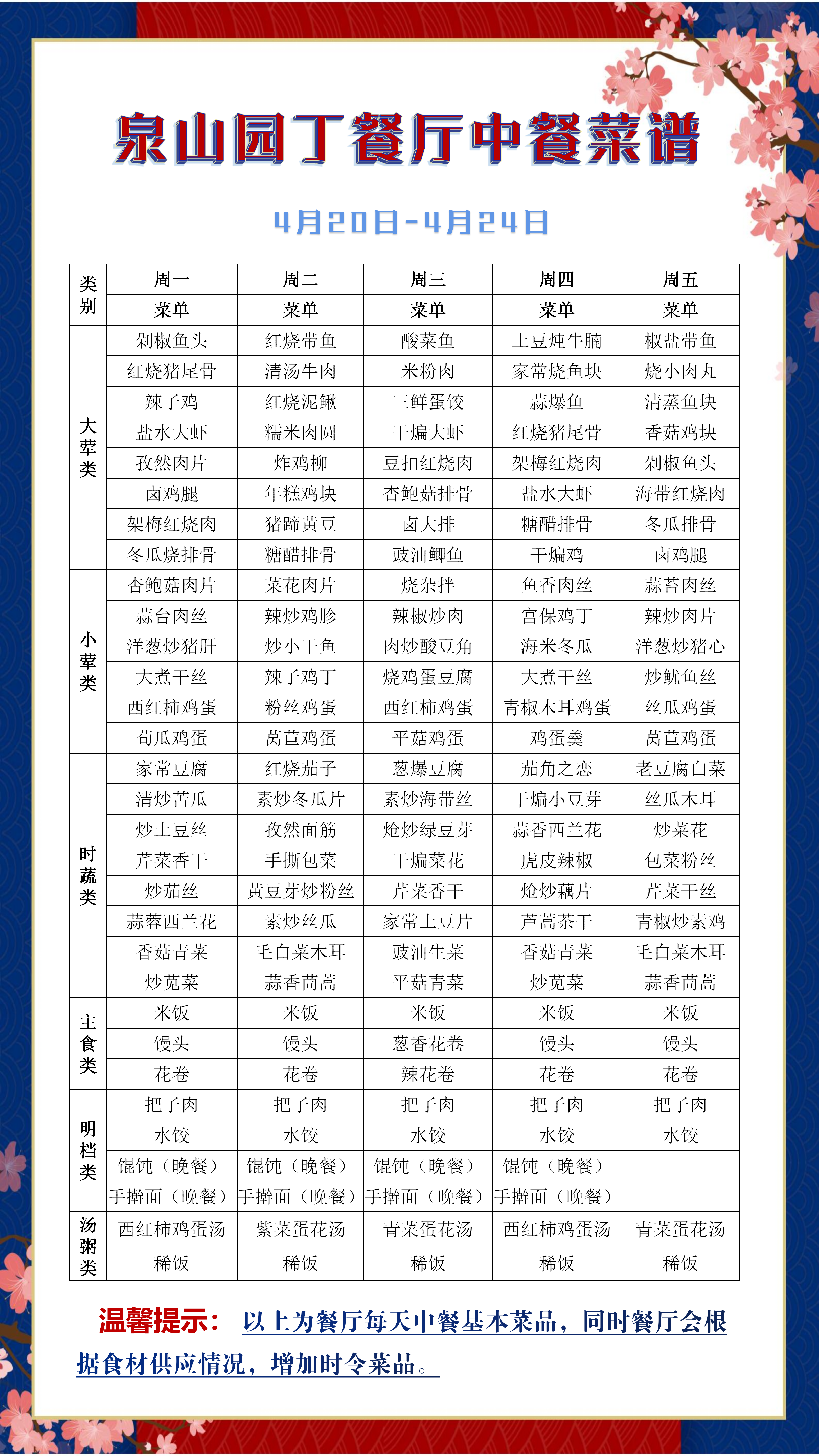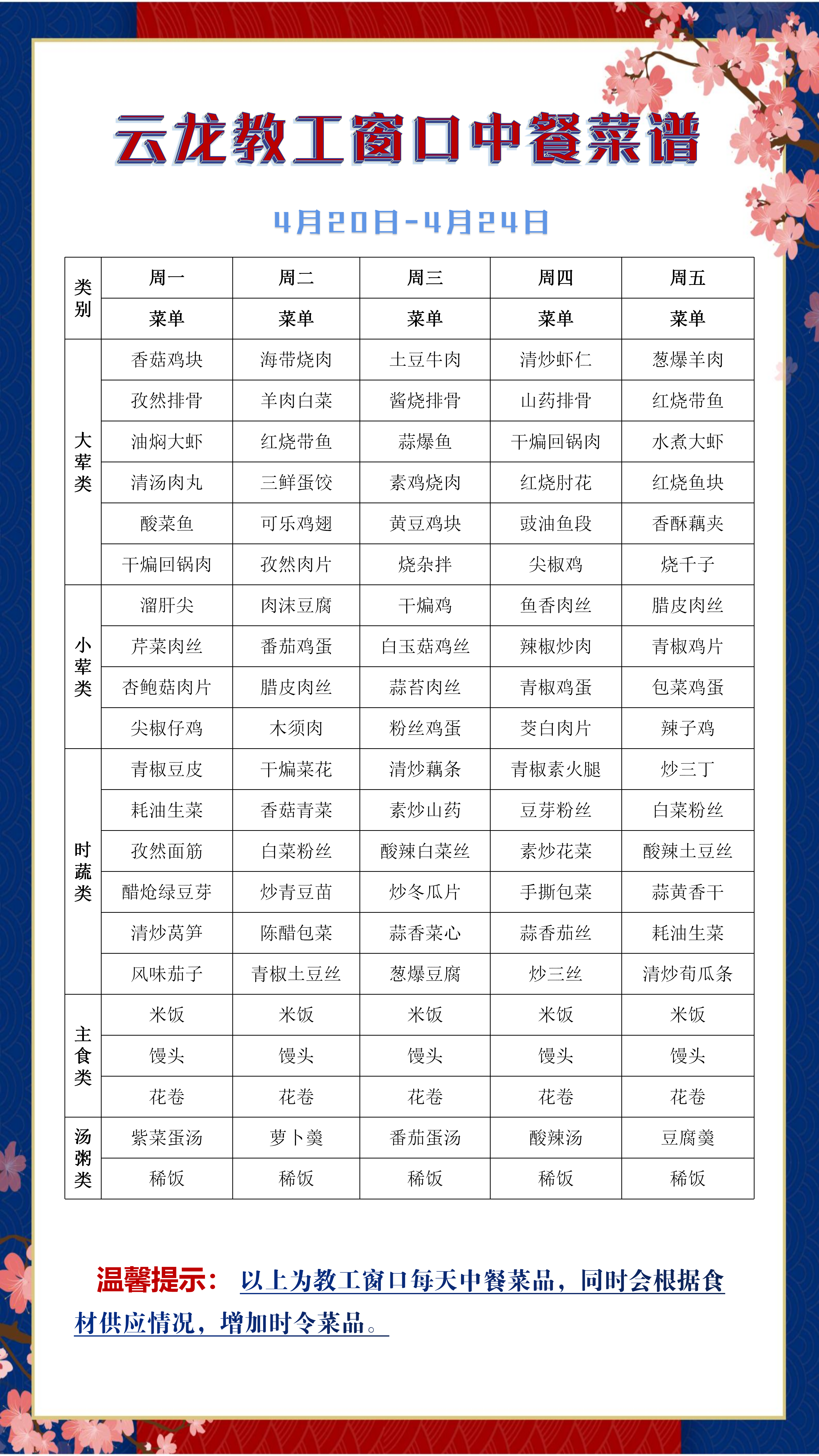 泉山园丁餐厅、云龙教工窗口中餐菜谱(4月20日-4月24日)