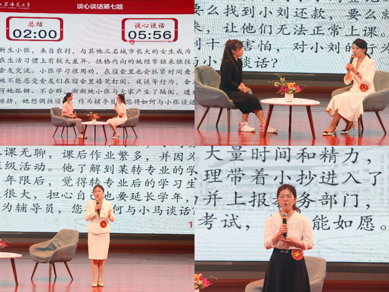 决赛分为真我风采、案例研讨和谈心谈话三个环节。风采展示的舞台上,结合自身特长,辅导员们以丰富的节目形式、富有感染力的表现,充分展现了学生工作队伍良好的精神风貌。案例研讨环节选手们相互提问,共同剖析问题、总结规律,展示了青年辅导员过硬的思想政治教育水平和深厚的政治理论素养;谈心谈话环节选手们面对棘手问题,迅速找准症结、耐心疏导,诠释了新时代教育工作者“以生为本”“立德树人”的责任和情怀。经过激烈角逐,姚峥嵘、余永芳、汪满莎、符靖璇、胡思雨等5位老师获得一等奖;侯秀杰、鲍春晓、刘星君、杨晓童、魏麟欣、戴笑笑、张帆帆、刘梦、陈建福等9位老师获得二等奖;鹿璐、王亦男、崔沁宇、赵彤、沈晓强、夏浩、李京展、陈碧燕、房天宇、赵宁、王艺璇、李雨晴、戴冠、代鑫等14位老师获得三等奖。