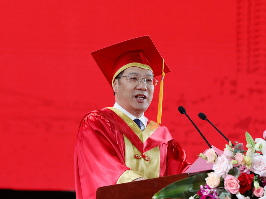 伴随着庄严的国歌声,毕业典礼正式开幕。校长、校学位评定委员会主席周汝光在典礼上致辞,代表学校向圆满完成学业的毕业生们表示热烈祝贺,向辛勤培育、陪伴支持毕业生的老师和家长致以衷心感谢。周汝光以“擦亮青春底色,唱响时代之音”为题,饱含深情地回顾了全体毕业研究生在读期间取得的成绩,充分肯定了大家在疫情防控期间与学校息息相通,甘苦与共,用实际行动关注支持学校事业发展作出的努力。他寄语全体毕业研究生,生逢伟大时代,不仅要学有所成,更要学有所思、学有所用,做持之以恒的自律者、坚韧不拔的奋斗者、矢志不渝的爱国者。周汝光勉励全体毕业研究生要传承好“崇德厚学,励志敏行”的校训,心中有阳光,脚下有力量,笃行致远、惟实励新,不坠青云之志,创造无愧于时代的精彩人生。