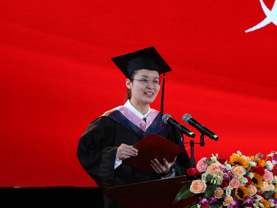 文学院“廖序东”班班长,国家奖学金、省三好学生、省优秀学生干部、省优秀毕业生、2021年度“苏师榜样”获得者陆海铭同学作为毕业生代表发言。她带领同学们一起回顾四年大学生活,表达了对母校、师长和同窗的感恩之情,同时也许下了“为世界进文明,为人类造幸福”,“以青春之我”创造无愧于时代、无愧于祖国、无愧于母校之业绩的誓言。