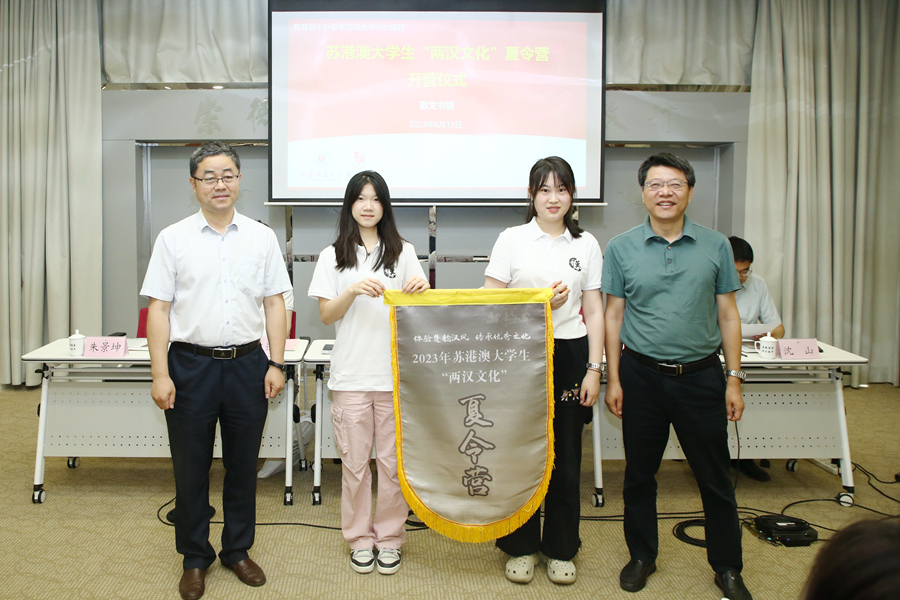 敬文书院负责同志介绍了徐州彭祖文化、两汉文化的历史渊源及本次夏令营的活动安排。双方营员代表先后发言后,澳门大学张昆仑书院向我校赠送该校文创纪念品。敬文书院党委负责同志与校港澳台事务办公室有关负责人共同为夏令营授旗。开营仪式后,文学院王淑梅教授为夏令营开设了首场讲座《汉赋鉴赏与汉诗吟诵》。