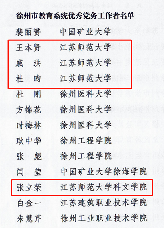 文学院党委“党员林中初心砺 苦战精神薪火传”、物理与电子工程学院党委“校企合作服务地方经济 党员先行彰显物电风采”获2022年度江苏高校最佳党日活动优胜奖,机关第二十二党支部“‘支部在线’推动高校基层党建工作数字化转型”获2021—2022年度江苏高校党建工作创新奖二等奖,公共管理与社会学院政治与公共管理系党支部、研究生党支部“口述历史传承抗美援朝精神 培根铸魂夯实党员信仰之基”获2021—2022年度江苏高校党建工作创新奖三等奖,文学院党委、物理与电子工程学院党委、机关第十五党支部、科文学院党委文理学院党总支被授予徐州市教育系统“先进基层党组织”称号,郝其宏、张辉、王娟(教科)、刘江、鲍文娜(科文)同志被授予徐州市教育系统“优秀共产党员”称号,王本贤、戚洪、杜昀、张立荣(科文)同志被授予徐州市教育系统“优秀党务工作者”称号。
