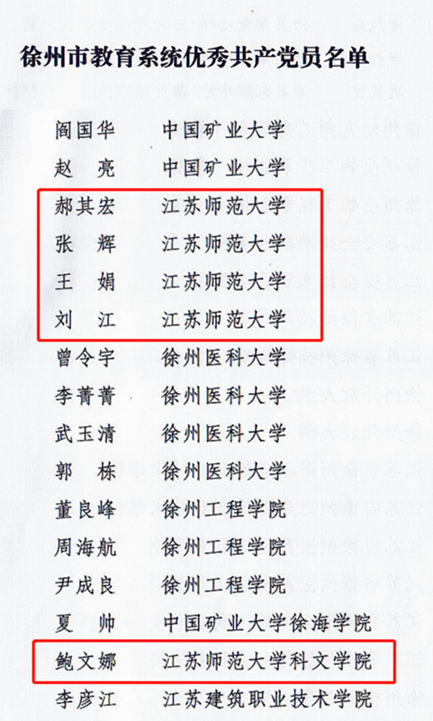 近日,江苏省委教育工委印发了《省委教育工委关于公布江苏高校2021—2022年度党建工作创新奖和2022年度最佳党日活动优胜奖评选结果的通知》(苏委教组函〔2023〕24号),徐州市委教育工委印发了《关于表彰全市教育系统优秀共产党员、优秀党务工作者、先进基层党组织的决定》(徐委教〔2023〕12号),我校4个基层党组织获省委教育工委表彰,4个基层党组织和9名党员获市委教育工委表彰。