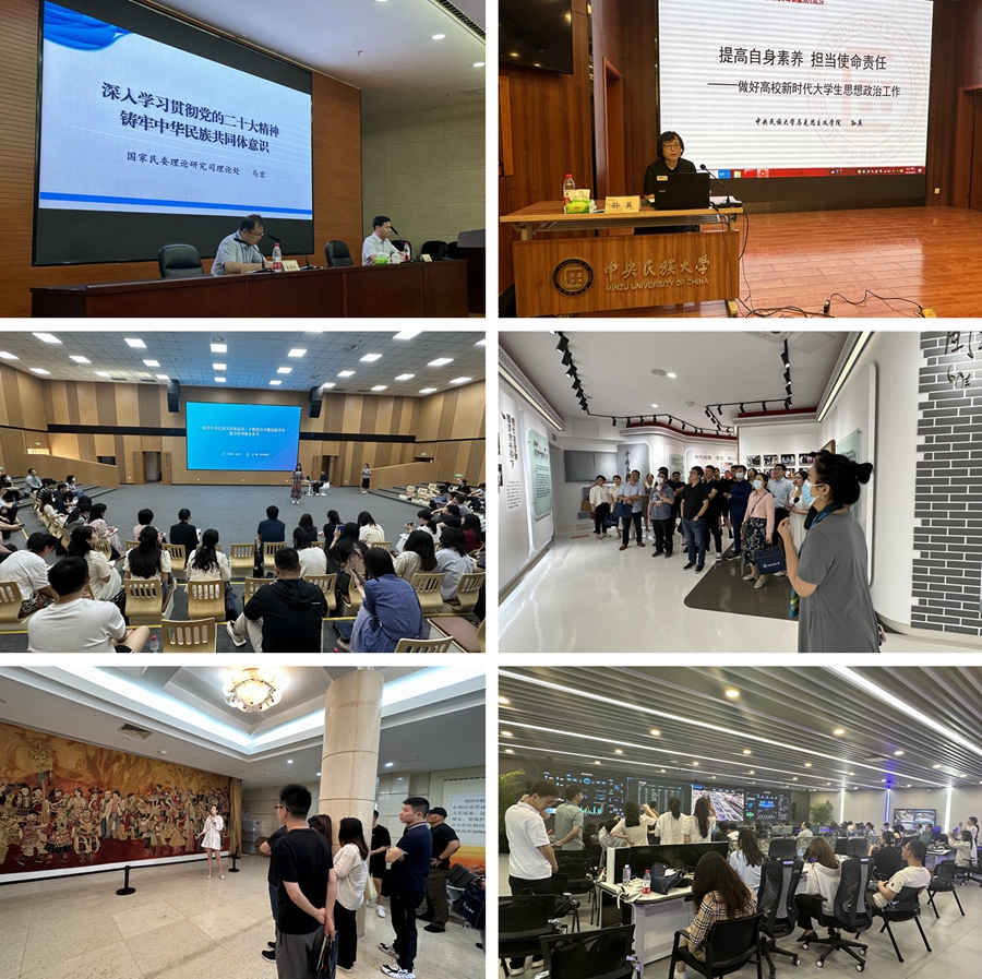 本次培训邀请国家民委理论研究司理论处马宏处长,中央民族大学马克思主义学院院长、博士生导师孙英教授,中央民族大学党委学生工作部麦什一副部长、陈钧副部长,分别做了《学习贯彻党的二十大精神,铸牢中华民族共同体意识》《提高自身素养,担当使命责任—做好高校新时代思想政治工作》专题讲座,并就“做好民族学生管理工作经验交流”等议题进行深入的交流研讨。除理论学习和座谈交流外,本次培训还设置中国共产党历史展览馆、中华民族共同体体验馆、民族博物馆以及中央民族大学校史校情展览四个现场教学点位,并分批次组织观看中央民族大学品牌展演《再见民大》。