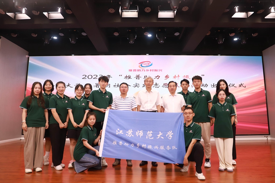 7月9日,由教育部语言文字应用管理司、共青团中央青年发展部共同主办的2023年“推普助力乡村振兴”全国大学生暑期社会实践志愿服务活动出征仪式在我校举行。教育部语言文字应用管理司宣教处处长张艳,我校党委书记方忠,副校长钱进和教育部长江学者特聘教授,江苏师范大学国家语委语言能力高等研究院院长杨亦鸣出席出征仪式。来自北京大学、清华大学等573所高校1176支团队的大学生志愿者通过线上线下的方式参加出征仪式。出征仪式上,张艳处长和杨亦鸣教授为实践团代表授予物资,江苏师范大学志愿者代表仲俊儒带领实践团学生代表进行庄严宣誓。出征仪式结束后,12405名大学生志愿者将在短暂培训过后分赴祖国大地的边疆地区、民族地区和农村地区开展推普助力乡村振兴社会实践活动。