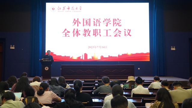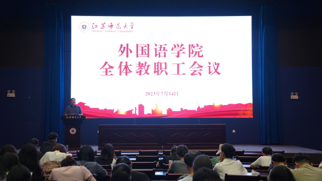 7月14日下午,外国语学院召开全体教职工大会,回顾总结前一阶段工作,布置近期及假期相关工作安排。会议由学院党委书记顾振中主持。