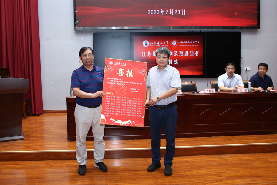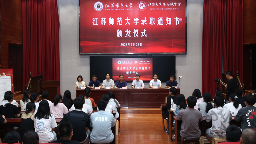 会上,校领导向新生和家长们从学校人才培养、师资队伍、学科建设、科技创新、国际交流等方面介绍了江苏师范大学的基本情况,并向录取的新同学表示热烈欢迎,希望新生们能够充分利用假期,尽快转变角色,提前做好学业规划,坚持学习和锻炼、素养与能力并重,自觉把个人之梦融入国家富强、民族复兴之梦中去。新生代表们纷纷表达了考入江苏师范大学的喜悦之情,同时对辛勤培育他们的中学表达了真诚谢意,展望了对未来大学生活的美好憧憬。与会领导与相关负责同志分别与家长和新生座谈交流。家长及受访中学领导纷纷表示,江苏师范大学校领导不辞辛苦,到各个学校现场颁发录取通知书,体现了对学生的关爱,是一堂生动的“大学第一课”,他们希望同学们进入大学以后,能够坚定理想、不忘初心、接续奋斗,创造属于自己、属于社会、属于国家和民族的无悔青春。