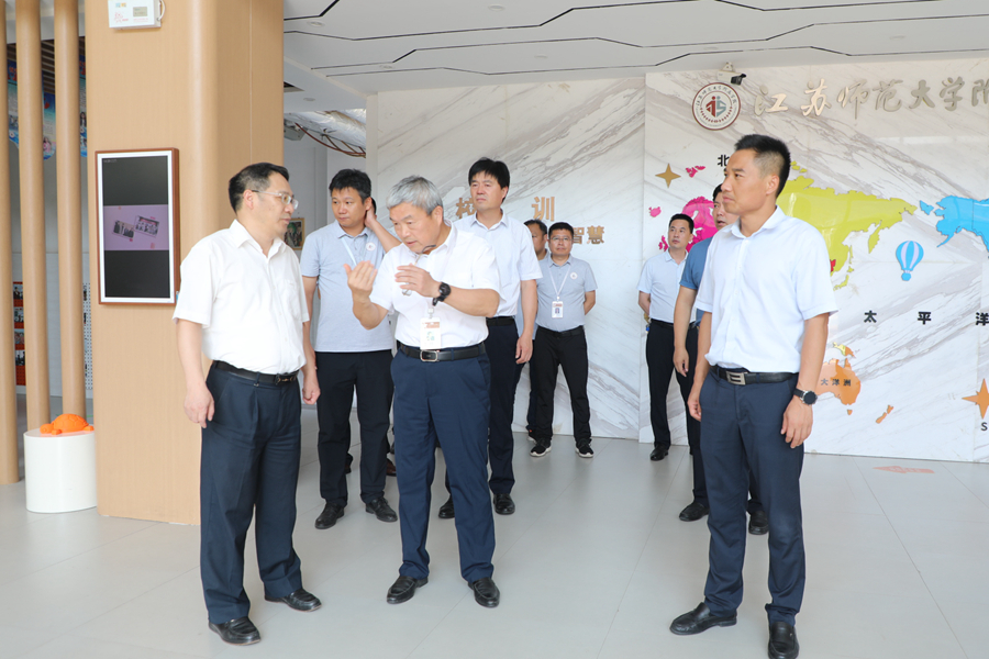 在江苏师范大学附属学校,周汝光一行实地走访了教师办公室、教室、文化长廊等,与教职工进行亲切交谈,进一步了解附属学校办学理念、办学规模、师资力量及软硬件设施等情况。交流会上,与会人员观看了附属学校的宣传片,听取了近年来该校关于发展历程和取得的成绩汇报。周汝光对附属学校的办学成效给予充分肯定,希望学校依托师大教育资源优势,不断创新、砥砺前行,为教育事业的发展作出新的更大贡献。