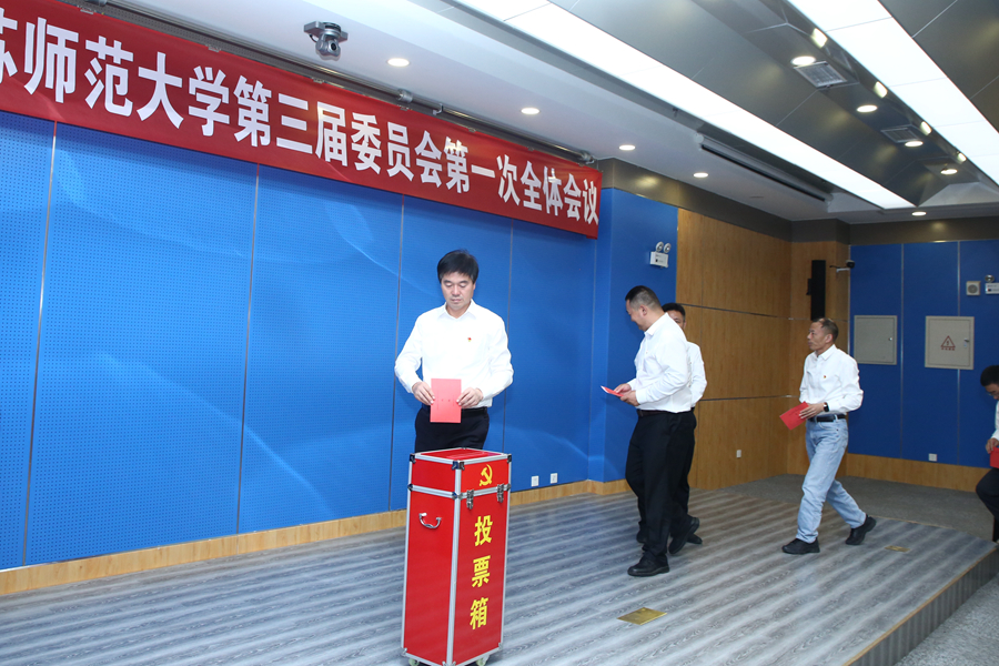 9月21日下午,中国共产党江苏师范大学第三届委员会举行第一次全体会议,选举产生中国共产党江苏师范大学第三届委员会常务委员会委员、书记和副书记。方忠同志当选中国共产党江苏师范大学第三届委员会书记,周汝光、蔡国春两位同志当选副书记。会议通过了中国共产党江苏师范大学第三届纪律检查委员会第一次会议选举结果,闾浩同志当选中国共产党江苏师范大学第三届纪律检查委员会书记,沈道海同志当选副书记。受中国共产党江苏师范大学第三次党员代表大会主席团的委托,方忠同志主持会议并讲话。省委督导组到会指导。