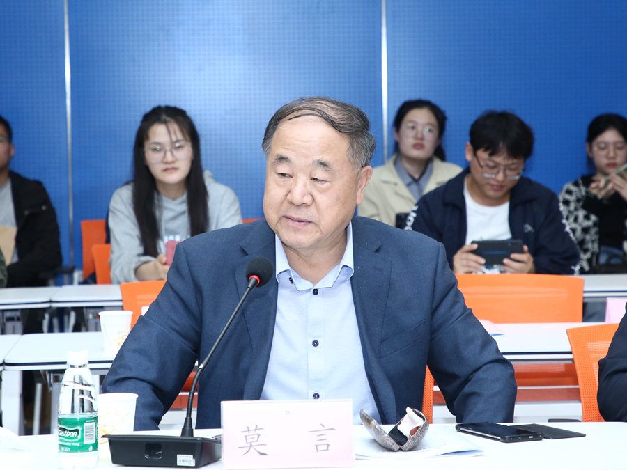 在报告会第二阶段,作家莫言、徐则臣与学者苏州大学文学院王尧教授、我校文学院郝敬波教授围绕莫言的艺术创作话题展开圆桌对谈。对谈由王尧教授主持。对谈会上,莫言阐述了由小说家向剧作家转型的思想动力和创作情结,回顾了从汤显祖到莎士比亚的中外戏剧传统,并就《鳄鱼》创作的相关背景作了介绍。徐则臣就后诺奖时代莫言的创作风格的深刻变化作了细致剖析,并以自身文学创作的实践体验阐释了文学传统书写的独特艺术魅力。王尧教授系统梳理了学术界对莫言作品的研究历程,对莫言作品的叙事特点、乡土意识、传统文化情怀作了深入点评。郝敬波教授重点谈了莫言作品的艺术影响力和带动效应,提出莫言艺术经验中的传统叙事、民间资源的传承与探索对徐则臣等一代作家产生了深刻的影响。报告会现场,莫言老师还就师生提出的相关学术问题进行了互动交流。