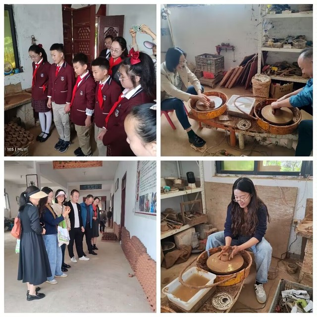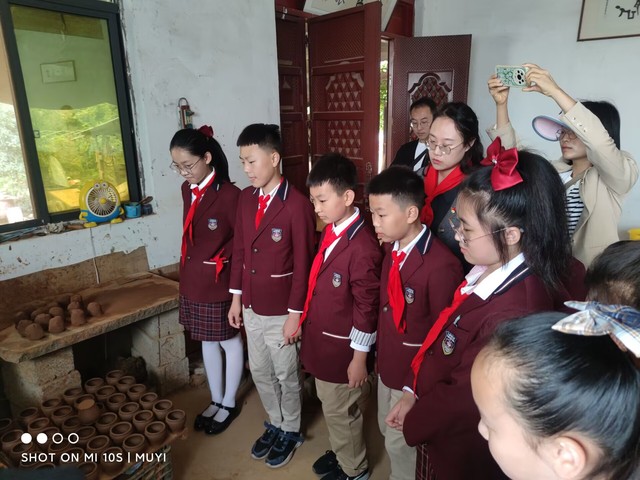 随后党员教师和少先队员一起走进土盆陶艺制作中心张氏制陶坊,张氏陶作坊现已经六代传承,土盆张陶土罐烧制技艺,已被列入徐州市级非物质文化遗产。党员们观看了土盆制作的过程,了解了土盆经和泥、塑型、晾晒、烧制的制作流程,还亲手体验了拉胚,享受了一把制陶的乐趣。党员同志们被质朴浓厚的文化气息所感染着。