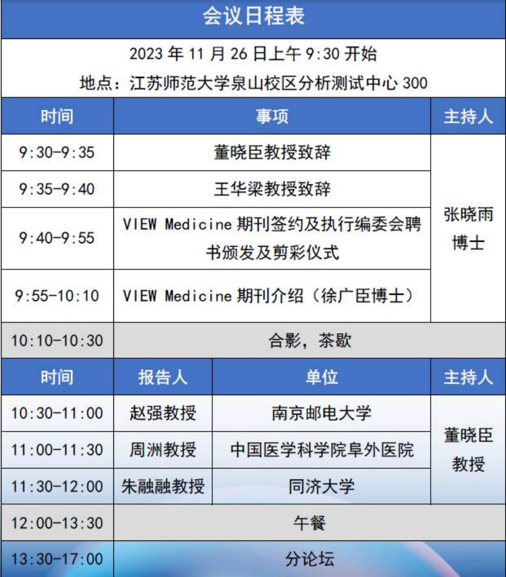 医学跨学科前沿论坛暨VIEW Medicine期刊创刊仪式是一个促进医学领域跨学科合作和学术交流的综合活动,旨在汇集来自不同领域的医学专业人士,包括医生、研究人员、学者和学生等,共同探讨医学领域的前沿课题和研究进展。本次论坛于2023年11月26日9:30-17:00在江苏师范大学泉山校区举行,由VIEW Medicine、江苏师范大学、江苏省材料学会主办,江苏师范大学化学与材料科学学院、江苏圣理工学院-中俄学院共同承办,热忱欢迎广大高校师生和研究人员参加本次论坛。
