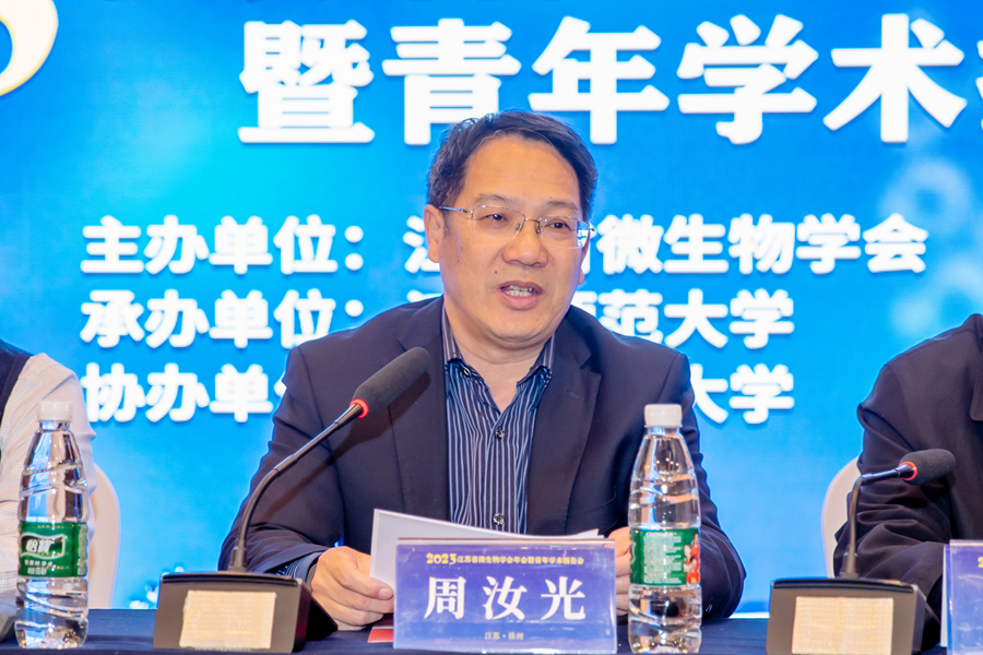 周汝光在开幕式致辞中向来自全国各地的专家学者和参会人员表示欢迎,向学会给予学校的信任和支持表示感谢,并向与会专家介绍了学校的基本情况。他指出,江苏师大依托“江苏省生物学优势学科”“江苏省生态学重点培育学科”等学科优势,积极推动团队创新发展,先后获批“江苏省药用植物生物技术重点实验室”“江苏省药食资源生物技术国家重点实验室(培育点)”“江苏省系统发育与比较基因组学重点实验室”,获得江苏省高校“微生物前期开发”和“系统发育与比较基因组学”优秀科技创新团队等多项荣誉。近年来,微生物学领域实现了多项研究成果的新突破,在团队建设、人才培养、科学研究和国际合作等也取得了显著成效。同时希望通过此次学术年会,进一步加强微生物专家学者之间的合作与交流,推动微生物学科的进步与发展。