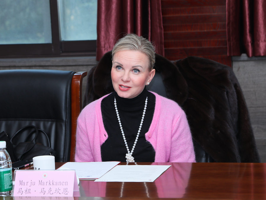 Marju Markkanen对我校的热情接待表示感谢,并详细介绍了芬兰的育人理念、学生培养方式、教育体系等情况。她表示,芬兰和中国一直保持着友好关系。新冠疫情后,教学方法发生了很大变化,她希望能与江苏师大在基础教育、教学研究、人才培养等方面开展深入合作,通过合作寻找新机会,用教育改变世界。