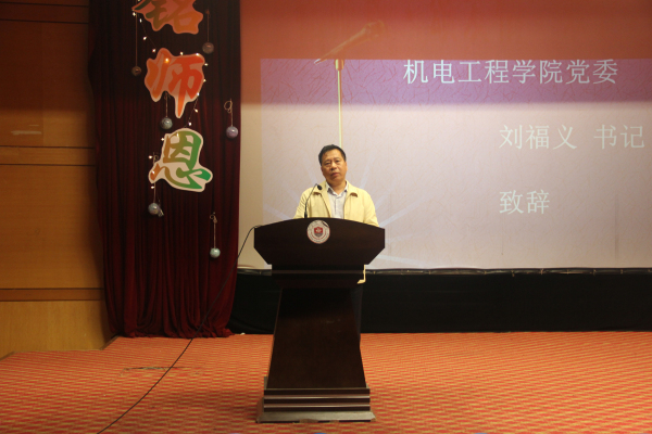 晚会以“铭师恩,颂友情”为主题,寓意良好,构思巧妙。晚会开场后,刘福义书记首先代表学院为全体毕业生致辞。他首先代表学院全体师生向圆满完成学业的2018届毕业生表示最热烈的祝贺,向为同学们成长付出辛勤劳动的所有老师表示最衷心的感谢和诚挚的敬意!刘福义书记对毕业生提出几点希望:坚持不懈,发展机电行业;不断学习,提升自己;志存高远,与时俱进。他提到,无论同学们身处何方,母校永远是大家的坚强后盾和精神家园,希望同学们可以关注母校,关注机电,常回家看看,愿大家不断取得新成绩,为机电行业尽自己的一份力,为国家和社会做出贡献。