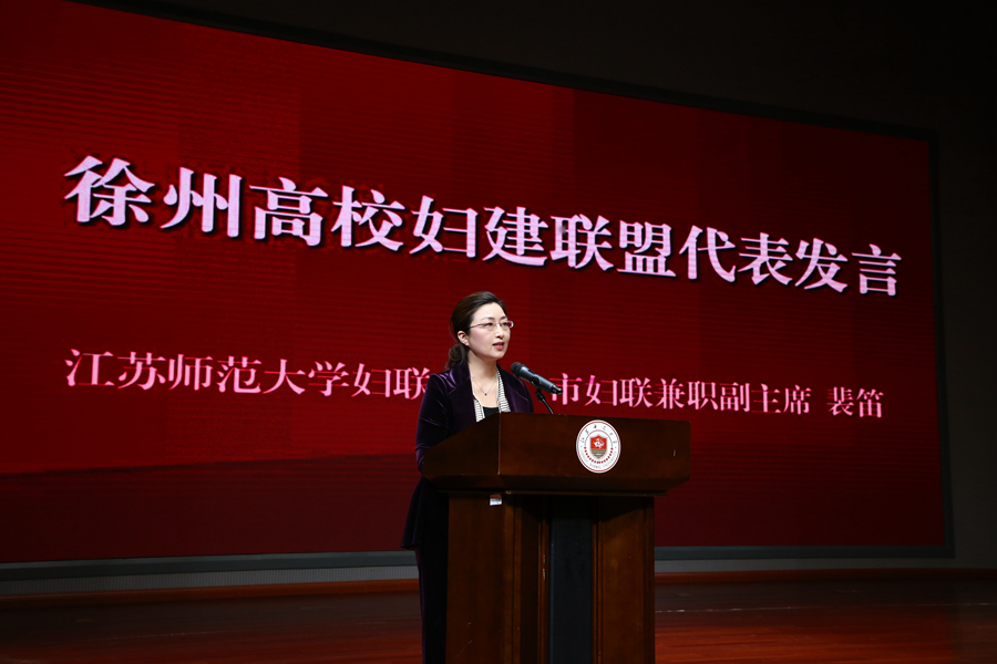 蔡国春在大会上致辞,向出席活动的嘉宾和师生表示热烈欢迎,向长期关心支持我校事业发展的市委市政府、市妇联以及兄弟高校的领导、同仁表示感谢。他指出,江苏师范大学党委坚持把妇女工作作为党的工作重要组成部分,重视发挥女性师生的智慧和力量,积极为女性师生成长成才创造条件、搭建平台。学校妇联充分发挥“引领、服务、联系”职能,带领全校女性师生在学校高水平大学建设的各条战线上贡献才智、建功立业,学校妇女事业呈现出蓬勃发展的良好态势。高校妇建联盟成立是新时代加强妇女工作的新形式新举措,通过阵地共建、活动共办、服务共促等方式,实现徐州高校妇建资源共享,为女性师生搭建新的交流活动平台,实现以联盟赋能巾帼“她力量”,将进一步促进高校妇女事业和妇联工作高质量发展。我校妇联将以此次活动为新起点,进一步加强与在徐高校妇女组织之间的协同协作,凝聚高校女性师生力量,为打造徐州高校妇女事业和妇联工作的“金字”招牌贡献力量。