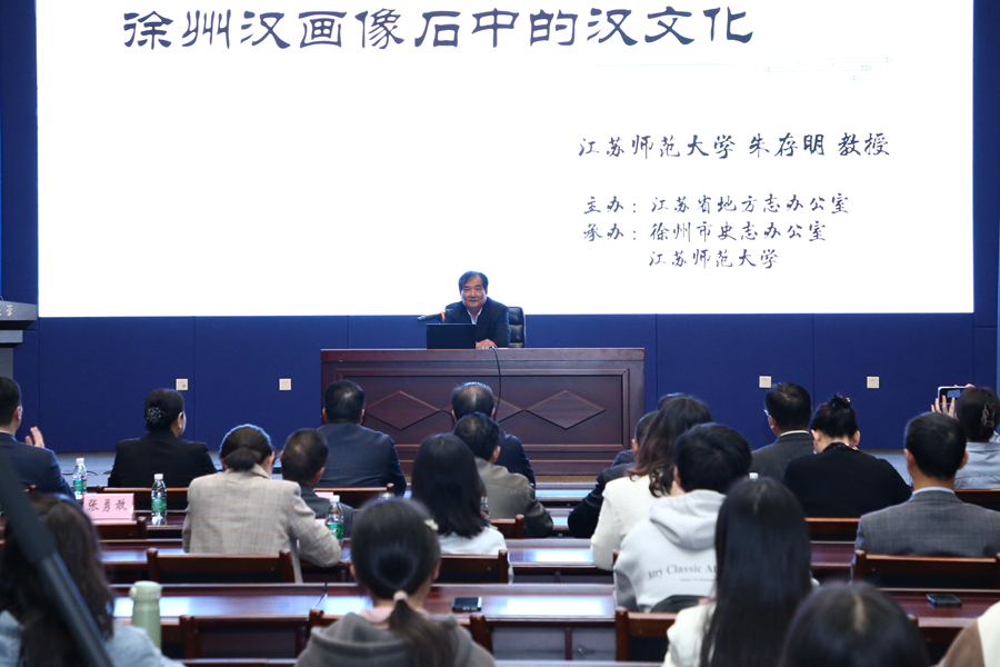 活动中,陈华代表江苏省地方志办公室向江苏师范大学赠送了《江苏省志》(首轮、二轮)。徐州市史志办公室党组书记、主任艾新建致活动开幕辞。徐州市史志办公室二级调研员邢艳玲代表徐州市史志办公室向江苏师范大学赠送了《徐州市志》《徐州年鉴》《中共徐州地方史》等志鉴、党史、地情书。我校汉文化研究院院长、文学院二级教授朱存明以《徐州汉画像石中的汉文化》为题,从作为地方志的徐州汉画像石看中华文明的突出特性、徐州汉文化与汉画像石、从汉画像石艺术看汉文化的精神内涵3个方面作了专题学术报告。