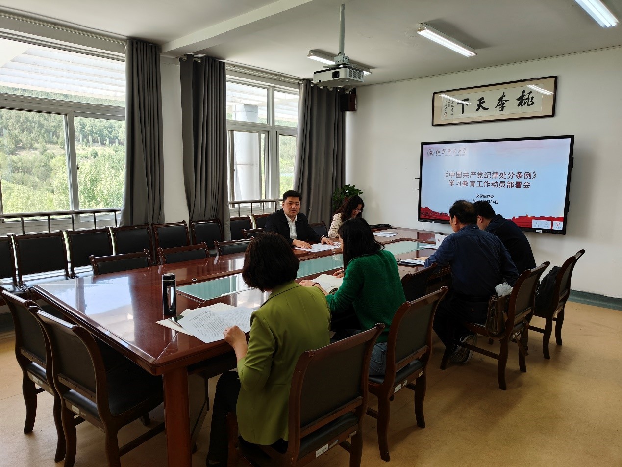 4月22日下午,文学院召开党纪学习教育工作动员部署会,传达学校关于开展党纪学习教育有关部署要求,研究部署学院党纪学习教育工作。会议由院党委书记葛大伟主持。