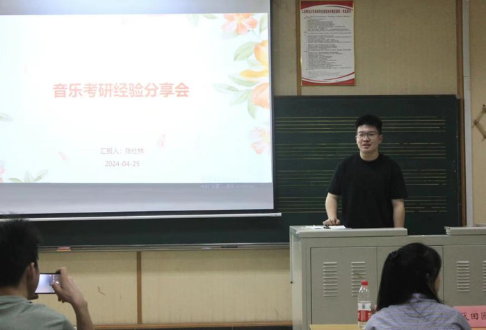 会议伊始,考取东北师范大学和山东艺术学院的王广和张仕林同学从考研院校的地区选择讲起,提醒同学们要注意选择考研院校的区位和对院校的综合实力,结合多方评估做出科学合理的选择,此外,他们也对于考研的学习英语与政治的方法进行了耐心细致的讲解。考取江苏师范大学和山东师范大学的代田园与毕一心同学突出强调了专业课的重要性以及考研这件事本身对个人意志力的磨练,分享了一些放松心态、缓解焦虑的方法,让在座的同学们受益匪浅。
