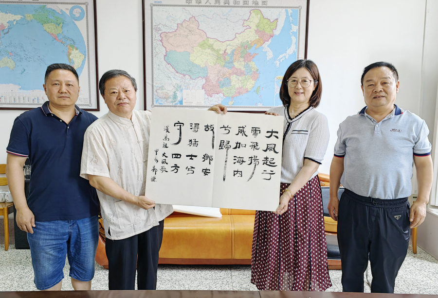 捐赠仪式前,郭谦先生一行和图书馆负责同志以及馆员代表举行了简短座谈会,会上,图书馆负责同志详细介绍了图书馆的发展历程与现状,并邀请郭谦先生现场创作书法作品。郭谦先生欣然应允,挥毫泼墨,书写《大风歌》书法作品赠送图书馆。