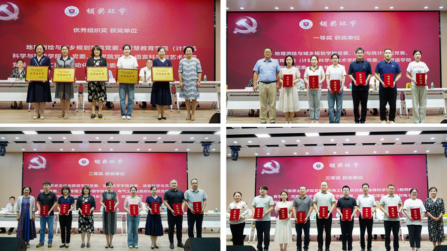 校党委常委、宣传部部长孟召学宣读了表彰文件。马克思主义学院党委等9家单位获三等奖,历史文化与旅游学院党委等8家单位获二等奖,地理测绘与城乡规划学院党委等6家单位获一等奖。智慧教育学院(计算机科学与技术学院 )党委等5家单位获优秀组织奖。校团委书记李丹,党委离退休部部长张吉东,党委研究生工作部部长王本贤,党校常务副校长、党委组织部副部长汤永怿分别为获奖单位代表颁发证书及奖牌。