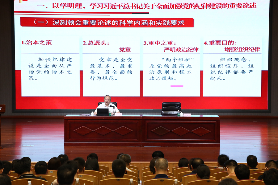 7月4日下午,校党委书记方忠以《扎实开展党纪学习教育 为学校高质量发展提供坚强政治保证》为题,为全校中层领导干部上了一堂生动的党纪学习教育专题党课。在校全体校领导、全校中层干部聆听了党课。校党委副书记、校长周汝光主持党课。