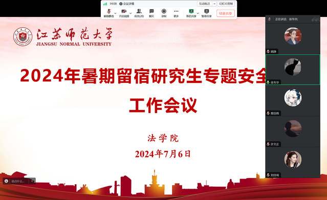 会上,徐书记详细解读了研究生暑期留校研究生管理规定,强调留校研究生须严格遵守暑期校园和宿舍安全管理规定,强调留校研究生须严格遵守暑期校园和宿舍安全管理规定和晚点名纪律;同时,徐书记聚焦溺水、火灾、交通事故、食品中毒、自然灾害、网络沉迷、诈骗等暑期易发多发的安全事件,将安全知识教育和法治教育、纪律教育相结合,全面系统的对同学们进行了安全专题教育。张院长强调,留校同学们要充分利用法律实务单位的宝贵实习资源,提升法律事务能力;合理规划科研学习任务,尽快确定论文选题,以充沛的精力投入科研学习和论文撰写。