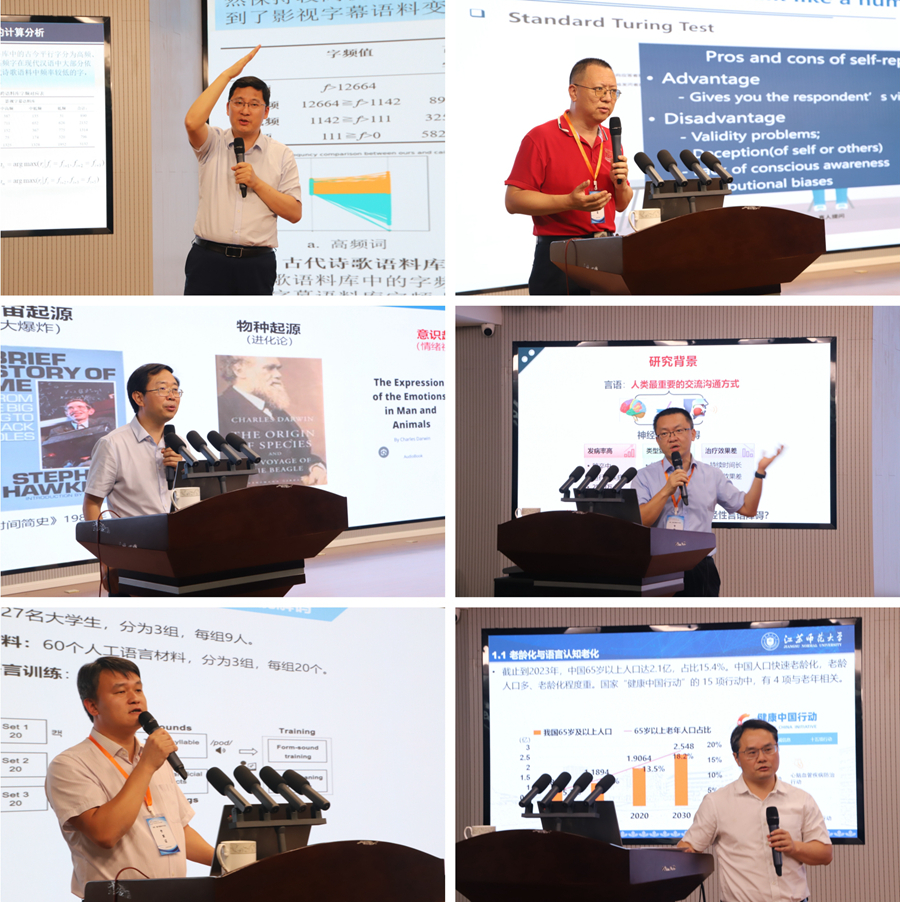 国际人类脑图谱学会(OHBM)主席、北京大学讲席教授高家红首先分享了《人脑成像技术及其在认知研究中的应用》;华东师范大学心理与认知科学学院教授蔡清做了题为《大脑中的语义表征和加工》的报告;香港中文大学语言学及现代语言学系副教授冯刚毅的报告聚焦于《语言学习与加工的大脑动态表征》;上海科技大学计算认知与转化神经科学实验室主任李远宁教授做了题为《语音感知与表达的神经机制、模型与脑机接口》的报告;江苏师范大学副教授胡伟在《语言神经基础的分子生物学视角》的报告中,介绍了全基因组测序、基因编辑技术及脑类器官等新技术在语言研究中的应用前景;中国科学技术大学张效初教授做了题为《人对AI的感知与态度研究》的报告;南京师范大学心理学院院长陈庆荣教授分享了《古诗阅读的计算和认知神经机制》;中国科学院心理研究所研究员杜忆做了题为《人脑的皮层拓扑组织模式支持语义提取的脑网络动态交互模式》的报告;北京师范大学心理学部认知神经科学与学习国家重点实验室教授、IDG麦戈文脑研究院教授秦绍正做了题为《人脑情感认知的心理表征及其计算机制研究》的报告;中山大学附属第一医院康复医学科研究员刘汉军做了题为《经颅磁刺激联合因果推断分析揭示言语产生因果性机制的研究》的报告;华南师范大学心理学院教授、教育部哲学社会科学“儿童青少年阅读与发展” 实验室副主任梅磊磊做了题为《词汇阅读中左腹侧颞枕皮层的功能解析》的报告;江苏师范大学语言科学与艺术学院副院长、江苏特聘教授朱祖德做了题为《从健康老化到病理老化的语言退化不平衡特征》的报告。一场场特邀报告精彩丰呈,学者们交流了研究成果,也为与会师生代表贡献了一场学术盛宴。