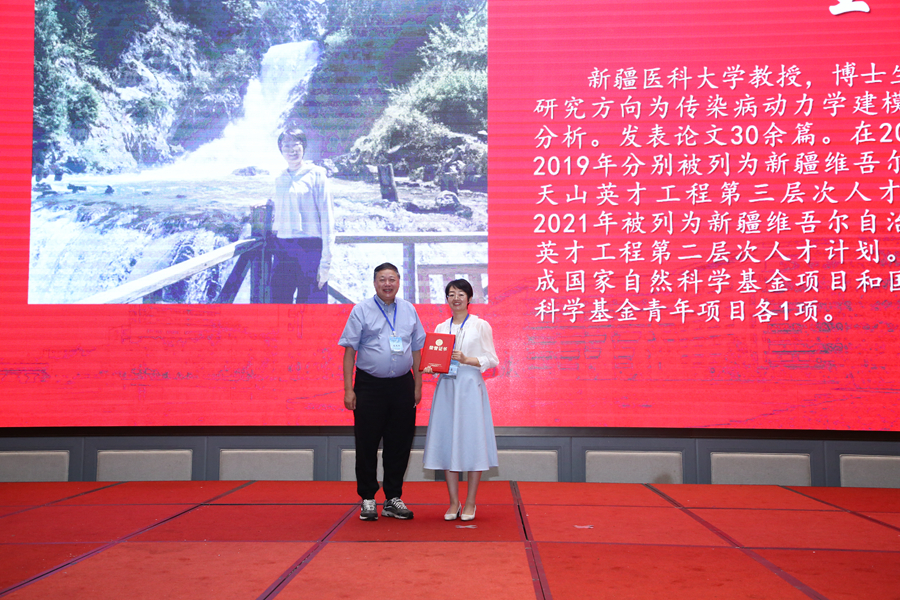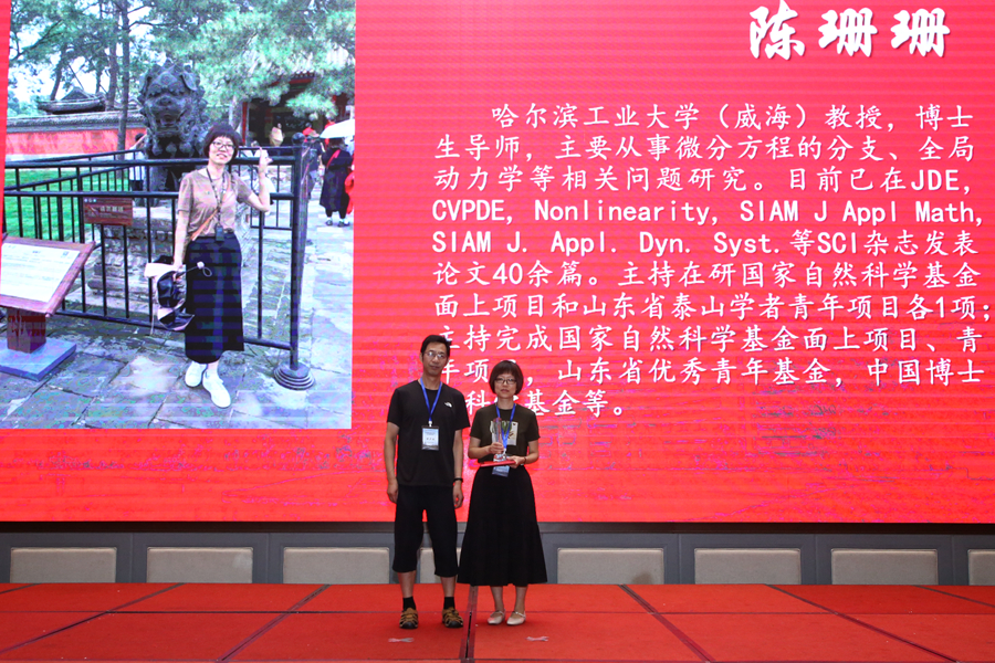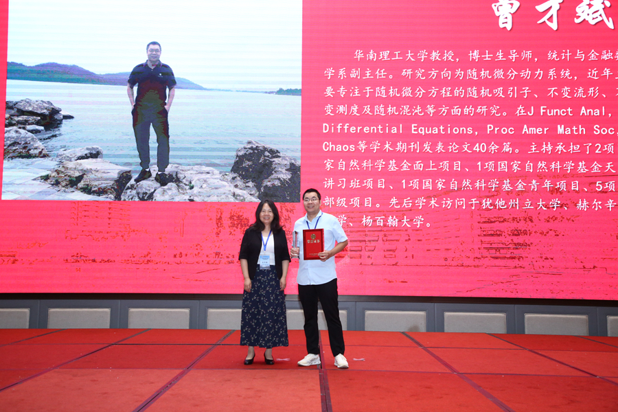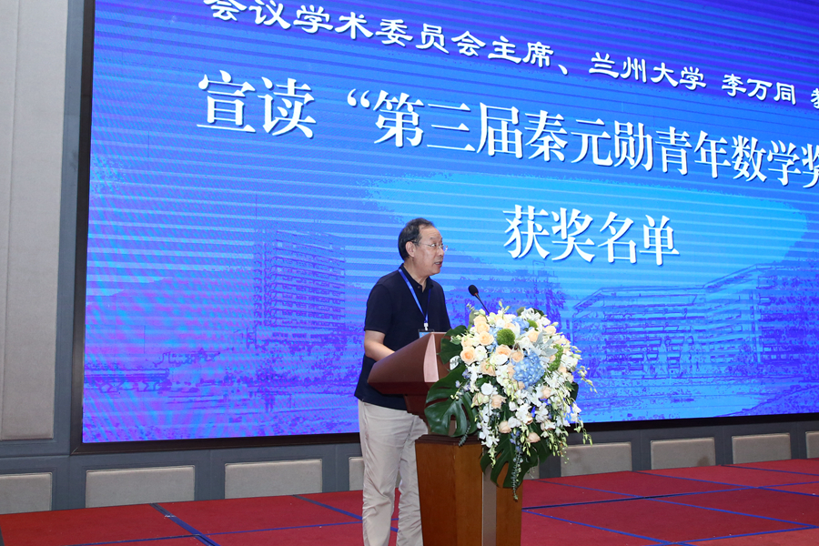 李万同代表评奖委员会宣读第三届秦元勋青年数学奖获奖名单。甘少波、肖冬梅、张伟年分别为哈尔滨工业大学(威海)陈珊珊教授、华南理工大学曾才斌教授、新疆医科大学王蕾教授颁发第三届秦元勋青年数学奖证书和奖杯。