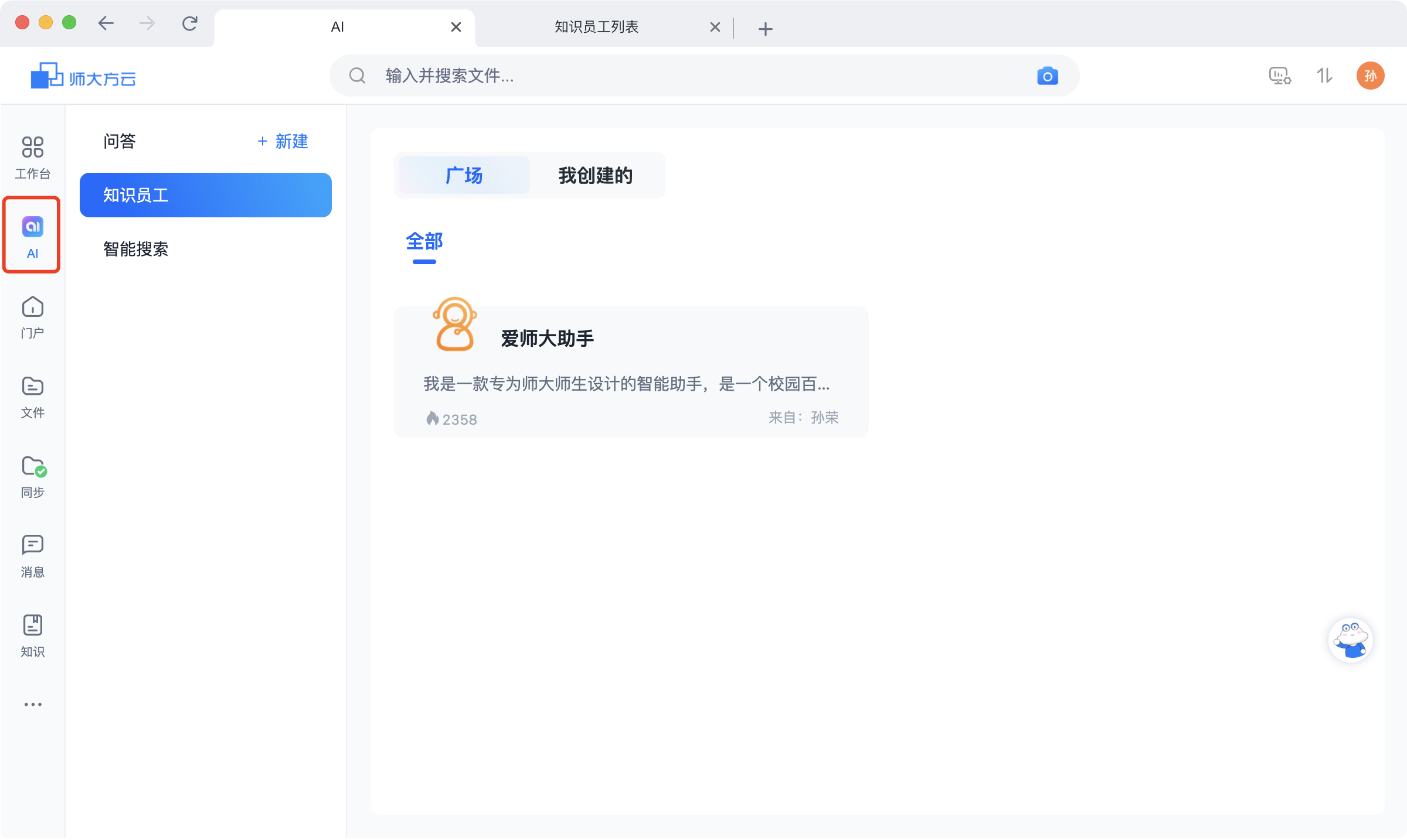 在“师大方云”的网页端或客户端,进入AI版块,点击“知识员工”,找到“爱师大助手”使用。同时师大方云的AI版块还提供了“会议纪要生成”“工作计划”“教案撰写”“网页解读”等更多功能,欢迎广大师生试用。