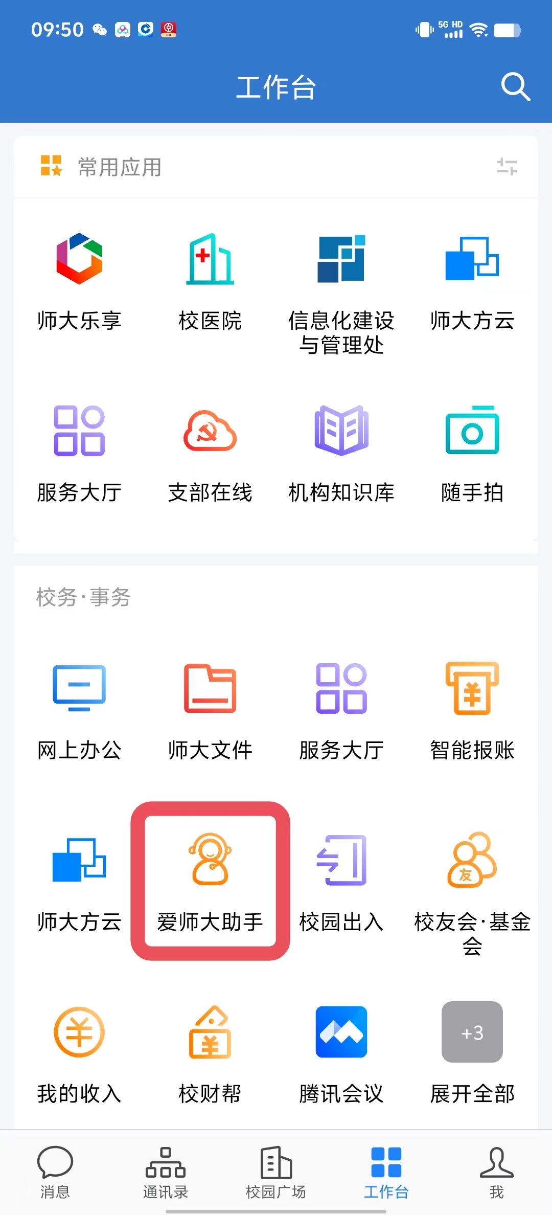 在“爱师大”手机端或PC端进入工作台,点击“爱师大助手”使用。